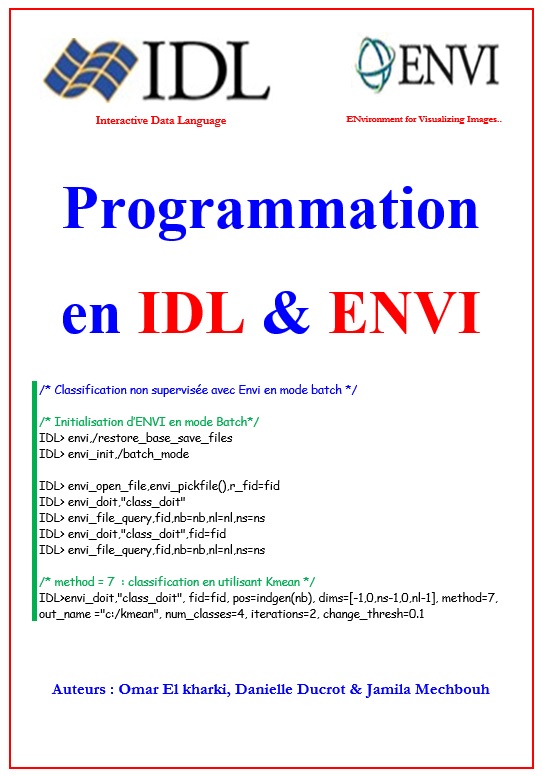 Ouvrage: Programmation en IDL & ENVI Auteurs : Omar El Kharki (elkharki@gmail.com), Jamila Mechbouh & Danielle Ducrot Liste des librairies qui distribuent nos ouvrages au Maroc Contenu de l'ouvrage "Programmation en IDL & ENVI" Cours et Travaux Dirigés : • Chapitre 01 : Programmation IDL • Chapitre 02 : Programmation orientée objets en IDL • Chapitre 03 : Programmation d’interface Homme Machine • Chapitre 04 : Programmation ENVI & IDL Travaux Pratiques : • Travaux pratiques corrigés La version papier est disponible dans les grandes librairies de votre ville (cliquez ici). Toutes les formations
